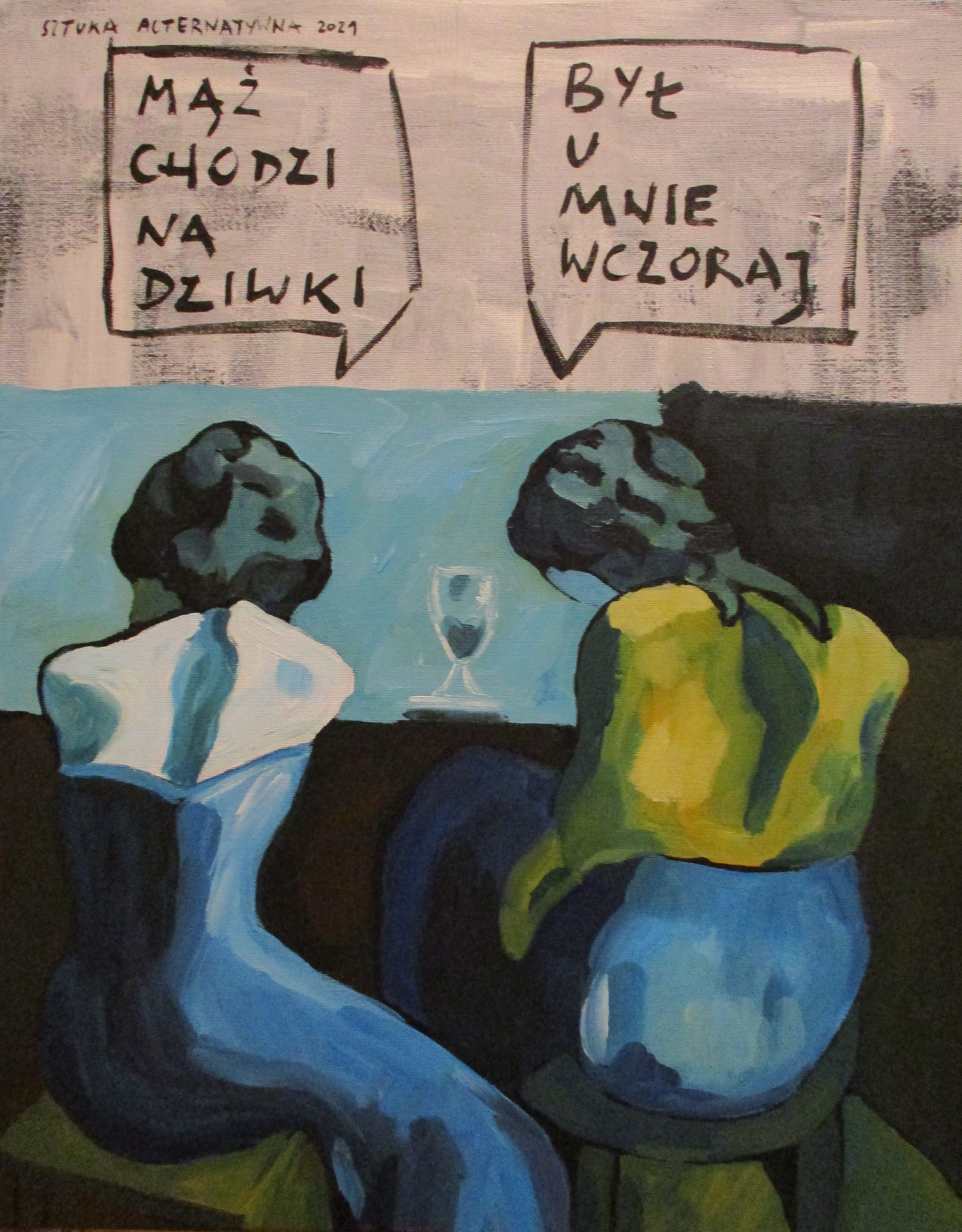 Mąż chodzi na dziwki, akryl, płótno, 40x50 cm.